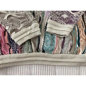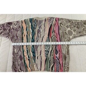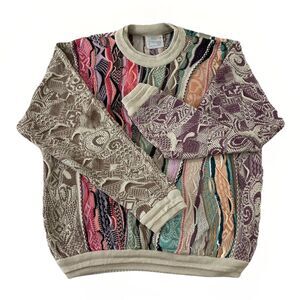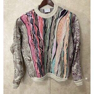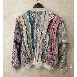 Rare Colors - Authentic COOGI Australia mens sweater in pastel multicolor cable knit. Features iconic 3D textured knit design made famous by the Cosby style sweaters of the '80s and '90s. RARE Vibrant pastel palette in premium cotton constructionbold, eye-catching, and highly collectible. Perfect for vintage streetwear lovers or anyone who appreciates retro luxury fashion.