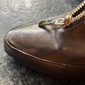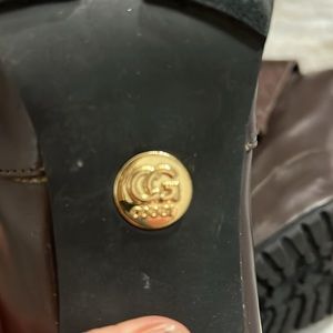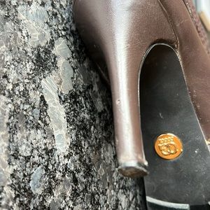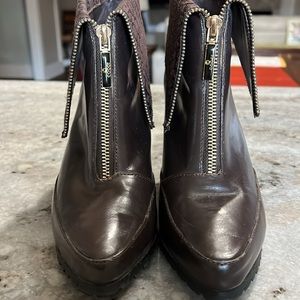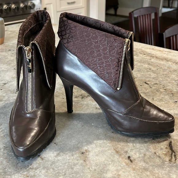 Fabulous pre-owned brown stiletto booties by COOGI. Signature fabric on the cuff. Minor scuff on bottom of heel and toe. See pictures. Style is Rihanna.