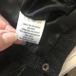 Wonderful COOGI short charcoal gray coat or long jacket. Features include zip on detachable hood, four patch pockets with snap flaps, front zipper with snap placket, buckles at wrists, and leather piping trim. Excellent pre-owned condition.