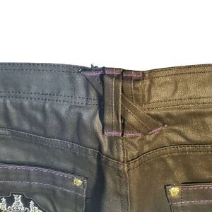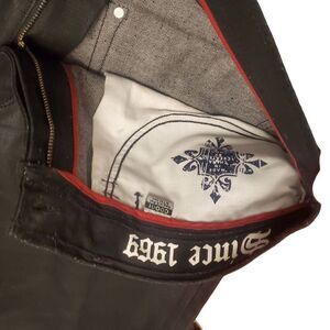 The are a heavy still denim with a bit of sheen to them. Please refer to all photos for details and condition.