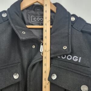 Coogi military-style wool-blend jacket, also referred to as a pea coat. It features a full zipper and button closure, along with four front pockets with snap buttons and epaulets on the shoulders.