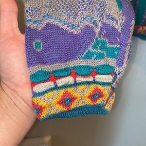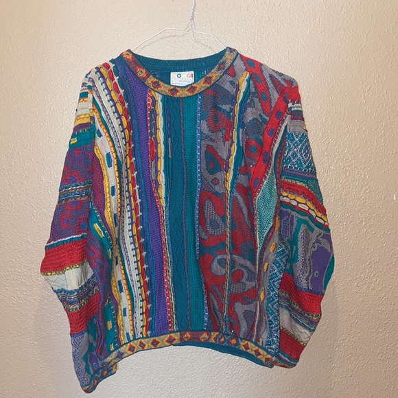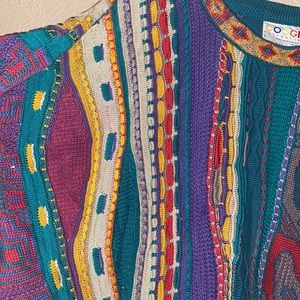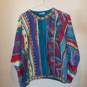Vibrant COOGI sweater with intricate patterns. Features bold stripes and abstract designs. Perfect for a standout look.