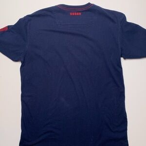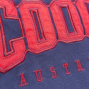 COOGI vintage 1980s embroidered tee. Navy blue with red twill/embroidery decoration. 100% cotton. A few spots with minor discoloration, see photos. Size tag at neck has been removed but appears to be a men’s Large. Measures 21” laying flat, pit to pit. Shoulder to hem is 28”.