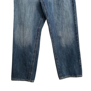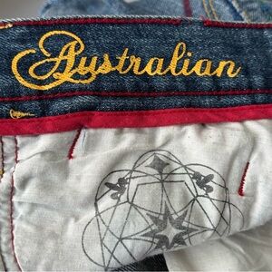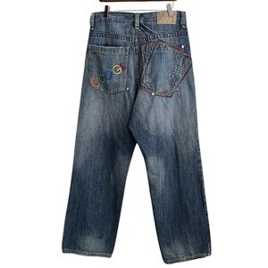 100% cotton, no stretch denim Y2K Coogi jeans. Relaxed fit with wide straight legs, zip fly and 5 pockets. It has contrasting red and yellow stitching and embroidered designs on both back pockets and front left pocket. Has factory fading and animal hair back brand patch.