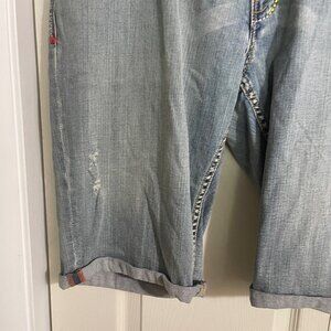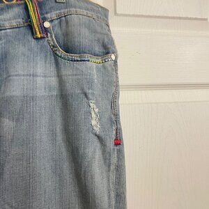 COOGI Womens Rainbow Embroidered Pocket Distressed Cuffed Bermuda Jean Shorts 18. Measurements Waist: 38" Inseam: 14" Rise: 11" Offers always welcome! Measurements are approximations taken while hanging