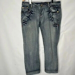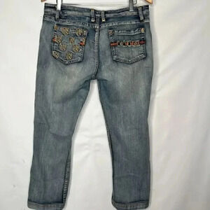 In great condition these cropped jeans are cool. Laying flat the waist is about 18 inches. The rise is about 9 inches. The inseam is about 25 inches. All items have been cleaned and comes from a smoke free home.