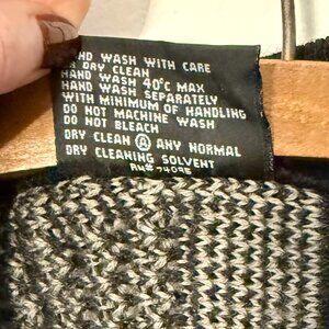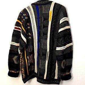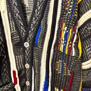 There is no tag information of materials for this sweater, Coogi sweaters are made primarily of Mercerized Cotton, known for durability and color fastness. Coogi sweaters are limited run and made with special machines. Coogi sweaters are known for material, color, and 3D elements.