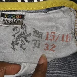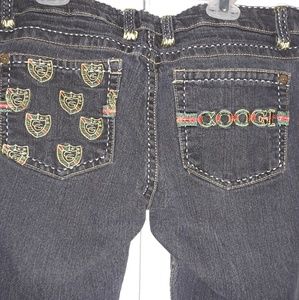 Black Coogi vintage jeans with green, red, and gold stitches of logo's on left pocket and strip of patch on right back pocket great for complimenting any casual wear worn a few times no tearing or stress wear great condition smoke free home