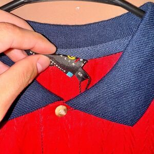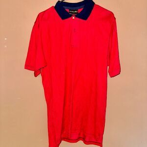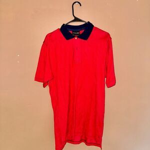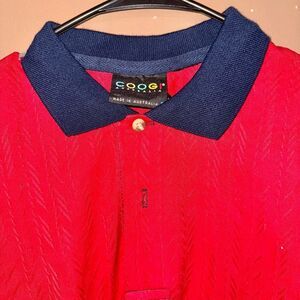 COOGI Australia Men's Short Sleeve Polo Tee in bright red. This polo features a unique zig-zag raised design and a navy blue collar, offering a cool and light material for ultimate comfort. In NWOT condition, it's like new!