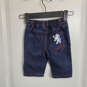 Super cute baby jeans from COOGI with red stitching throughout. Size 0-3 months