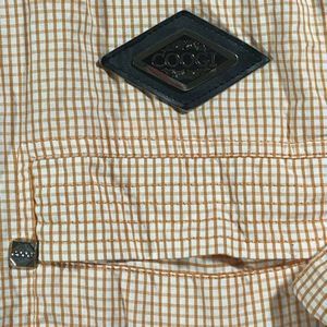 COOGI Mens Short Sleeve Button Up Shirt Orange Check Embroidered Emblem Size M.