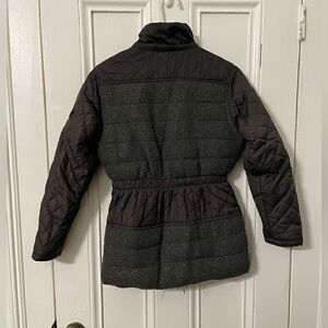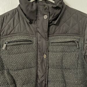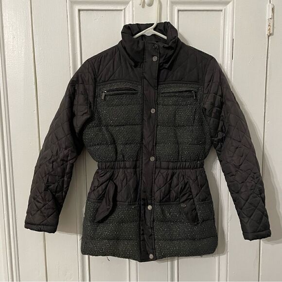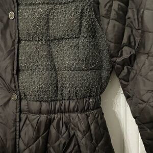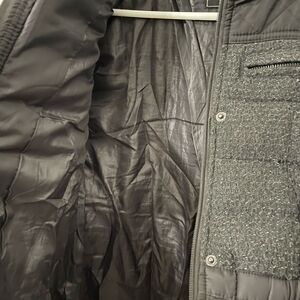 No holes or stains, some of the silver threads are hanging though shown in pics 100% polyester Chest - 18 inches Length - 25 3/4 inches Sleeves - 21.5 inches