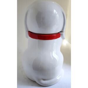 Cute counter treat / cookie jar. This is a solid white basset hound with big brown eyes. He is wearing a red collar. The head comes off and it seals with a rubber seal. It stands 10" tall with the lid on. In overall good condition. There is a chip on the inside of the lid where the rubber seal is. There is also some minor crazing on the head, mostly in the back. SEE LAST PICTURES. This is NOT a Pioneer Woman collection piece.