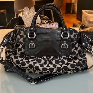 Elegant, vintage Coach satchel with iconic pattern. Features a black and cream signature design and silver hardware. I love this bag with a pair of denim jeans and a white collar man's button down shirt. The exterior is in very good vintage condition. The interior needs some TLC for there are some stains, price reflects. enjoy this bag. It is great for every day.❤️‼️