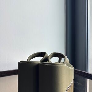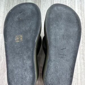 Bonded jersey slip-on sandals in green. Padded thong-style strap with rubberized logo patch at vamp.
