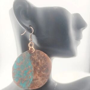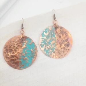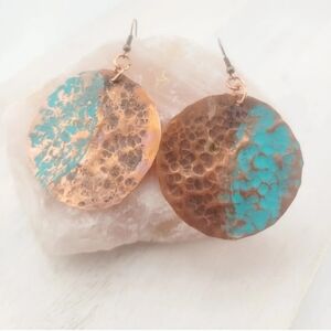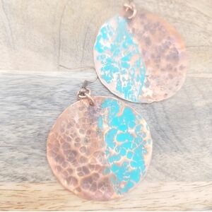 Copper metal earrings hammered for texture and painted with turquoise patina for the effect this earrings are lightweight