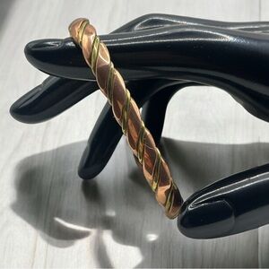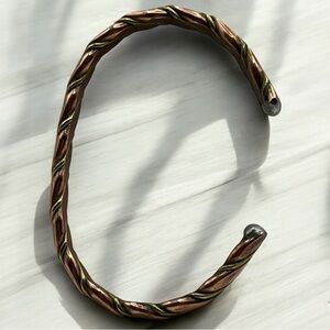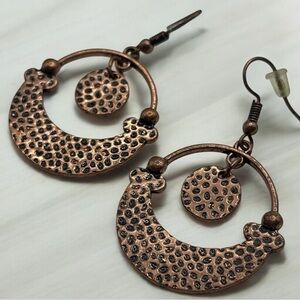 COPPER AND BRASS BRACELET, COPPER COLOR CIRCULAR EARRINGS, COPPER AND BRASS DROP EARRINGS.
