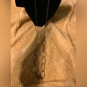 Has a 2–inch extender. Beautiful Copper Necklace with Matching Earrings. Necklace can be doubled to make it shorter. Graduated rings. So pretty. 21 1/2 inches long.