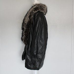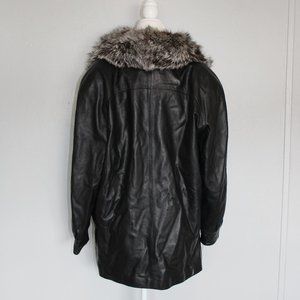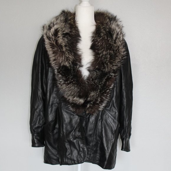 Liz Phillips black leather coat, shawl silver fox fur collar, button closure, 2 pockets, size tag states medium. Measurements are arm pit to pit 27", shoulders 20", sleeves 23" and length 31". My items are priced to sell! No over the top pricing like so many others!