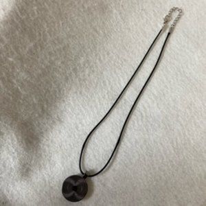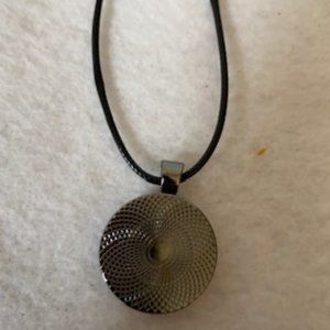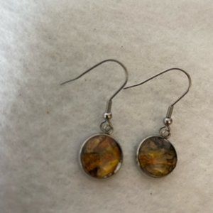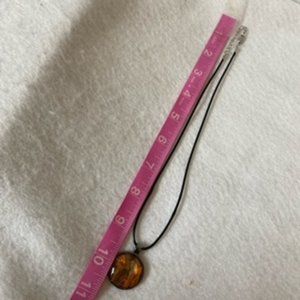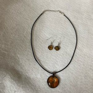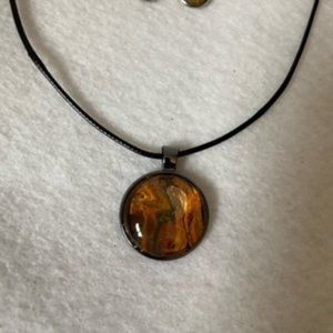 Acrylic Painted in oranges, golds and black set in a 1” pewter bezel pendant necklace with glass cabochon and matching earrings with silver color bezel and ear wires. 1 3/8” drop to earrings. 18” black cord necklace with claw clasp. Metal alloy. Hand crafted bohemian Individually unique new one of a kind hand crafted necklace and earrings.