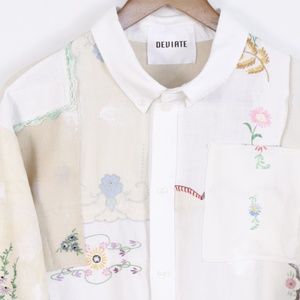 This collection is inspired by a Deviate original short story where Lee (our mouse/rat mascot) decides to leave the big city to find where he belongs, which he finds is in nature. The collection is made using 100% recycled and antique textiles. These textiles are inspired by the feeling of home including antique placemats, comforters, and other antique home goods.
