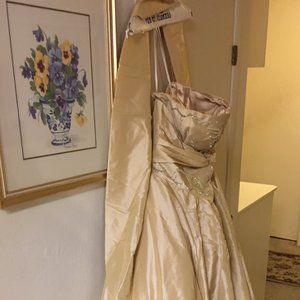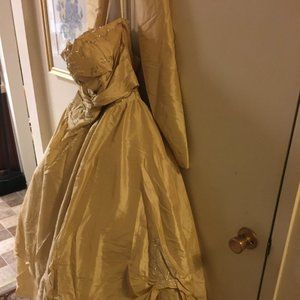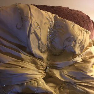 this Azure strapless ballgown is ideal for any formal event, whether it is a prom, wedding or any other event where formal gowns are required. this gown is beautiful with its embroidery and beaded embellishment. You are bound to feel like Cinderella in this gown! the color is champagne gold with ivory colored filigree embroidery and beadwork. I can see this as the ideal gown for a bridesmaid or even a bride. the trend is for brides to wear pastels. Why wear white when you can wear gold?!?