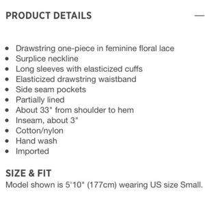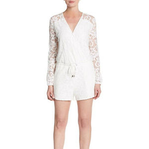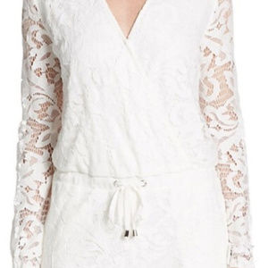 Romeo & Juliet Couture White Lace Romper Jumpsuit NWT This item has tags and shows no visible signs of wear - Drawstring one-piece in feminine floral lace - Surplice neckline - Long sleeves with elasticized cuffs - Elasticized drawstring waistband - Side seam pockets - Partially lined - Approx 33" from shoulder to hem - Approx Inseam, about 3" - Cotton/nylon