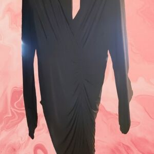 Pre-loved, great condition! Women's size Medium. Black Polyester/Rayon/Spandex blend black bodycon midi dress. Formfitted for showing those curves off with plenty of ruching throughout sleeves and bodice to camouflage "trouble areas".