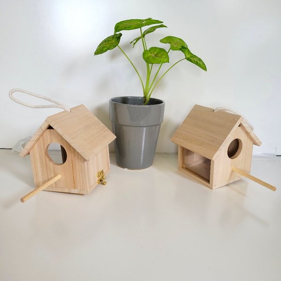 2 Bird houses for outside with pole clearance, window birdhouse includes rope for hanging and as an alternative to hanging comes with hinge attached to one side for attaching to a fence. Hummingbird, blue bird, swallow, sparrow, and finch will enjoy. Natural wood 6" H x 5 x 5.75. Plant not included. NEW