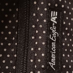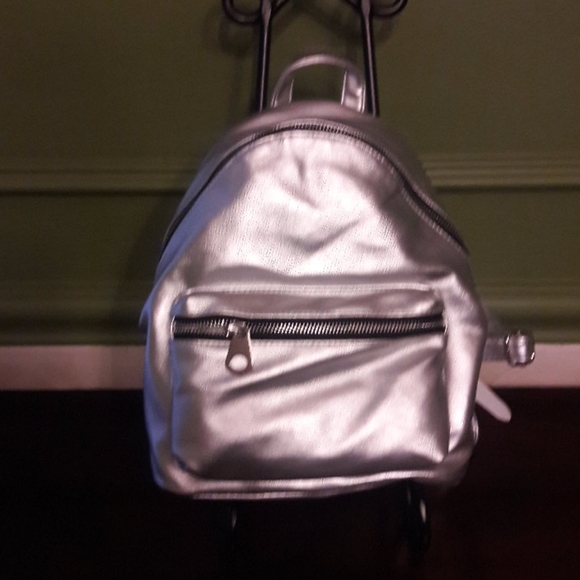 Medium-sized (Purses) Front zipper pocket.Black and White poka dot lining Inside also has a zipper pocket. BACKPACK IS LIGHT WEIGHT. CAN BE USED AS A EVERYDAY CARRY BAG. VERY FASHIONABLE. BACK TO SCHOOL IN STYLE