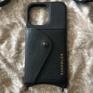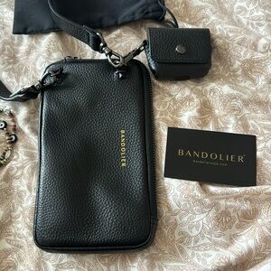 Bandolier case for iPhone 13 Pro and crossbody leather with AirPod pros case. Black and gunmetal tone. In great condition used once. Protective pouch bag.