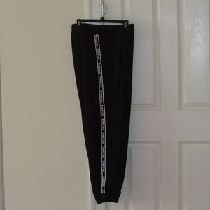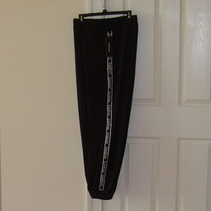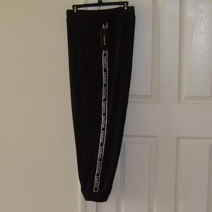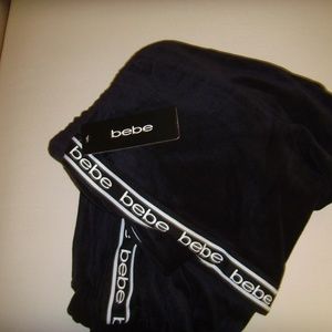 Brand NEW bebe black velour like, jogger style pants features elastic waist and legs. The bebe design marking is on the side of each leg. Size 2X, the fabric is composed of 95% polyester and 5% spandex. They are machine washable. Very comfortable. TWO PAIR AVAILABLE.