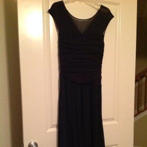 This lovely and elegant dress flows with you, as you move. It is sleek, but very forgiving in the mid-section. The rhinestone buckle holds draped fabric in place, perfectly. The dress is long and stops right above the ankle. (See photo #2). The multi-layered hem adds for a dramatic effect, be it on the dance floor or just walking across the room. UPDATE: There is one rhinestone missing in the buckle. Reduced from $40 to $30.