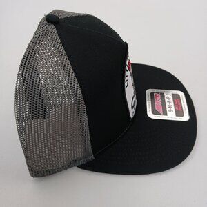 Stylish black and gray trucker hat featuring a unique patch design. Perfect for casual outings.