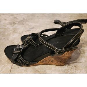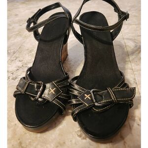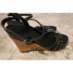 ▪︎DESCRIPTION: Black strappy shoes. Cork wedge heel