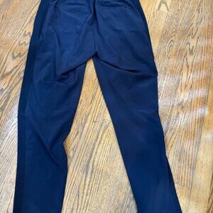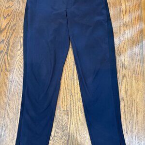 Pant is semi-fitted, skims easily over the body. Sits below the natural waist. Fits slim through the leg and eases up below the calf. Featherweight Stretch fabric. Rib knit waistband and side panels. Pant is in good condition.