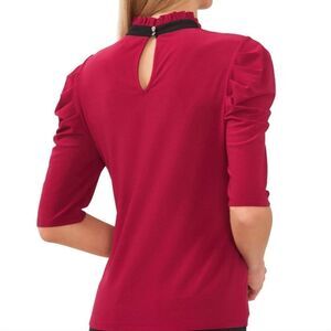 Done in polyester and spandex. Featuring a high neck, 3/4 length puff sleeve in a deep merlot. NWT.