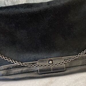 …with silver leather piping and gun metal chain strap and magnetic clasp and zippered inner compartment and hidden pocket in back for cell phone