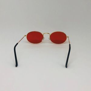 Oval frame. Red lens and gold metal frame with black earpiece. Retro style Vintage style sunglasses. Dainty glasses. Unisex.
