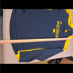 Michigan pullover with blue and yellow design. Features Adidas logo. Not sure what size this is. I would say a medium or large. The size is washed out, but I took measurements. It is in good shape, besides the size being washed out. 12-26-23