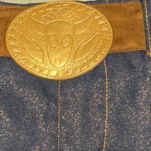 Attached faux leather belt with gold faux leather buckle featuring embossed details