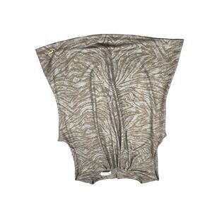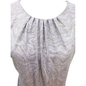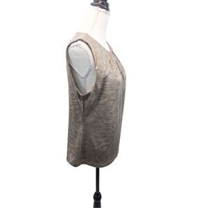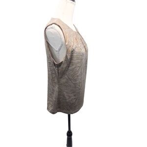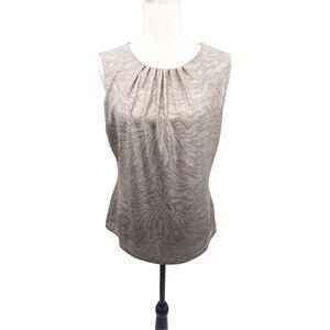 Sleeveless Calvin klein shimmering gold / silver blouse ruching at her neck scoop neck. Very flattering. No size tag. I believe it is a large. This is a personal item. I am a large In blouses.