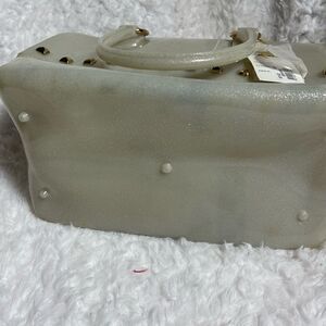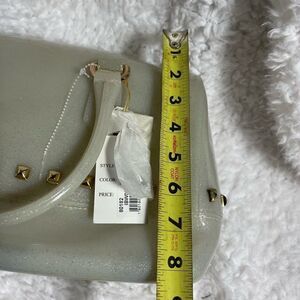 Candy jelly translucent silicone handbag with glitter texture and gold tone studs .top zipper and double handles does have a yellow transfer spot by the zipper top the bag is missing the key for the lock as well,see all pictures any questions please message.
