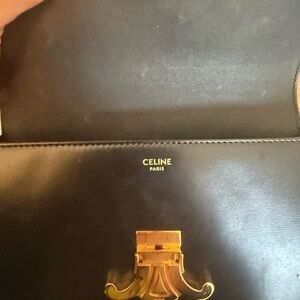 Elegant and timeless, this Celine black leather shoulder bag is perfect for any occasion. Featuring a sleek design with a gold accent, it adds a touch of luxury to your ensemble.