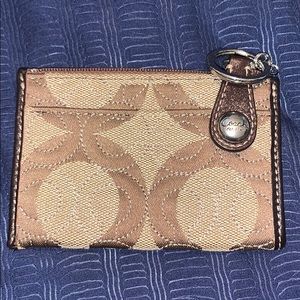 Brown and tan Coach C small purse. In amazing condition in and out. Comes with purse and coin purse. Coin purse is not exactly the same pattern but close and I used it that way. Smoke free pet free home.