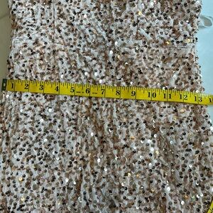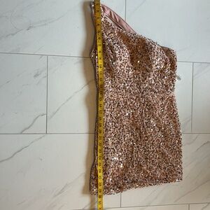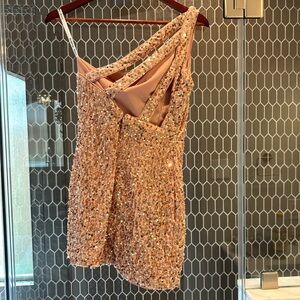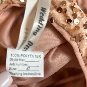 Pinkish/peach cocktail/HOCO dress. Size 0 but runs slightly big. Measures 30 inches from shoulder to knee. Never worn.