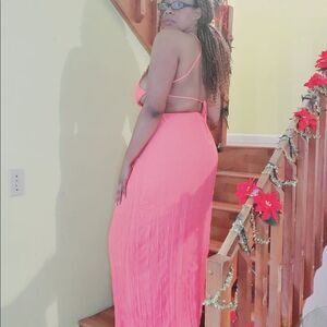 Cross back, solid coral color maxi dress; spaghetti strap, partial open back.