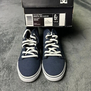 Introducing the DC Bristol Mid Canvas Women's Casual Skate Shoe in Blue, Size 6. This stylish sneaker features a mid-top shoe shaft style with lace-up closure and DC logo accents. The canvas fabric type provides a comfortable fit, making it perfect for casual occasions and skateboarding.