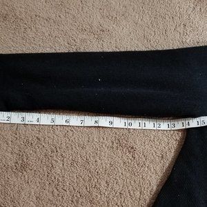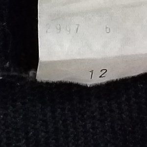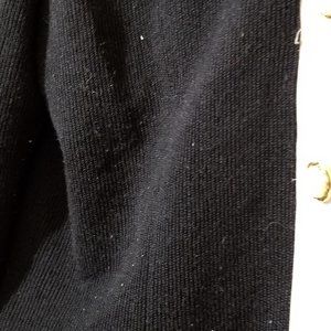 Classy top that can be worn on its own or as a jacket with another top underneath. Black sweater trimmed with white satiny material & pearlized look buttons trimmed in gold. Acrylic sweater, not wool, so not itchy or too warm. Single hook & eye closure at top. Unique shape with a notched angle cut hem. Shoulder pads. Material has some pilling but a razor/fabric shaver will take care of that. Well loved piece in my closet & got plenty of careful wear but now looking for new home. GUC.