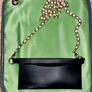 This elegant black clutch features a stylish chain strap, perfect for any occasion. Its sleek design adds a touch of sophistication to your ensemble.